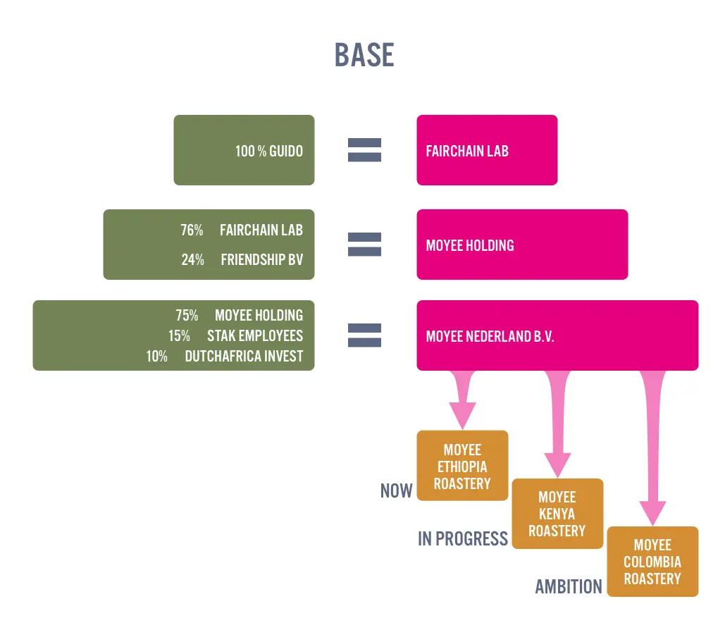 We werken aan een community ownership model waarin de restwaarde automatisch wordt verdeeld, ahv een gezamenlijk bepaald en 100% transparant herverdeel design. Het team, de ondernemer, de aandeelhouders en alle anderen die zijn betrokken in de keten (boeren/branders en klanten) hebben idealiter een gelijk deel.