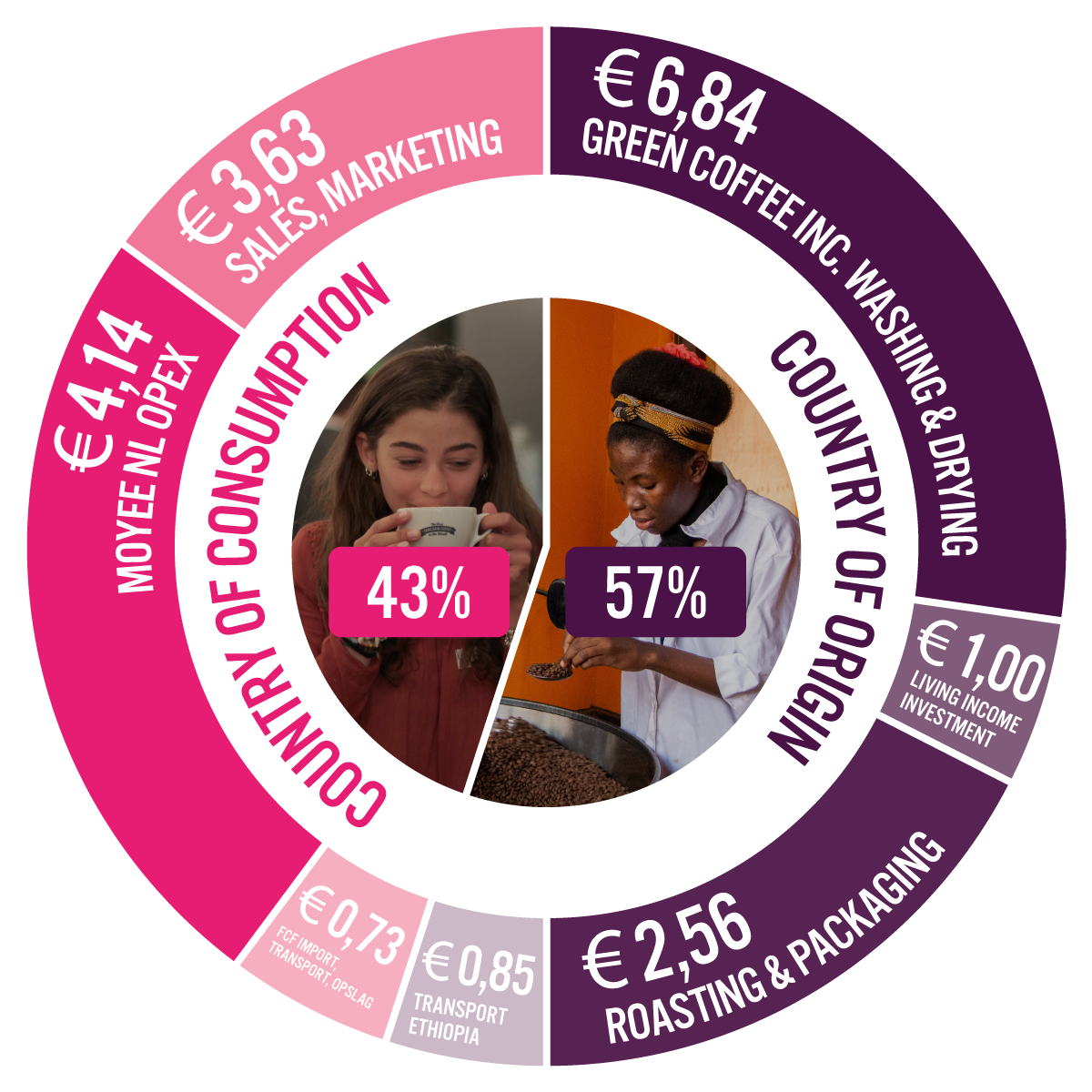 90% van de waarde van elke kop koffie verdwijnt in de zakken van multinationals, dit noemen wij ‘Big Coffee.’ Met ons FairChain model delen we de waarde 50/50 met lokale koffiegemeenschappen. Betekent dat minder winst voor ons? Yep. Maar door te telen, te branden en te verpakken in het land van herkomst, krijgen landen deze 50% die ze juist hard nodig hebben meer inkomen, kansen, infrastructuur en onderwijs. Het heeft ons meer dan tien jaar gekost om FairChain in gemeenschappen te integreren. Nu is het tijd om groots uit te breiden. Help armoede te bestrijden door FairChain te drinken.