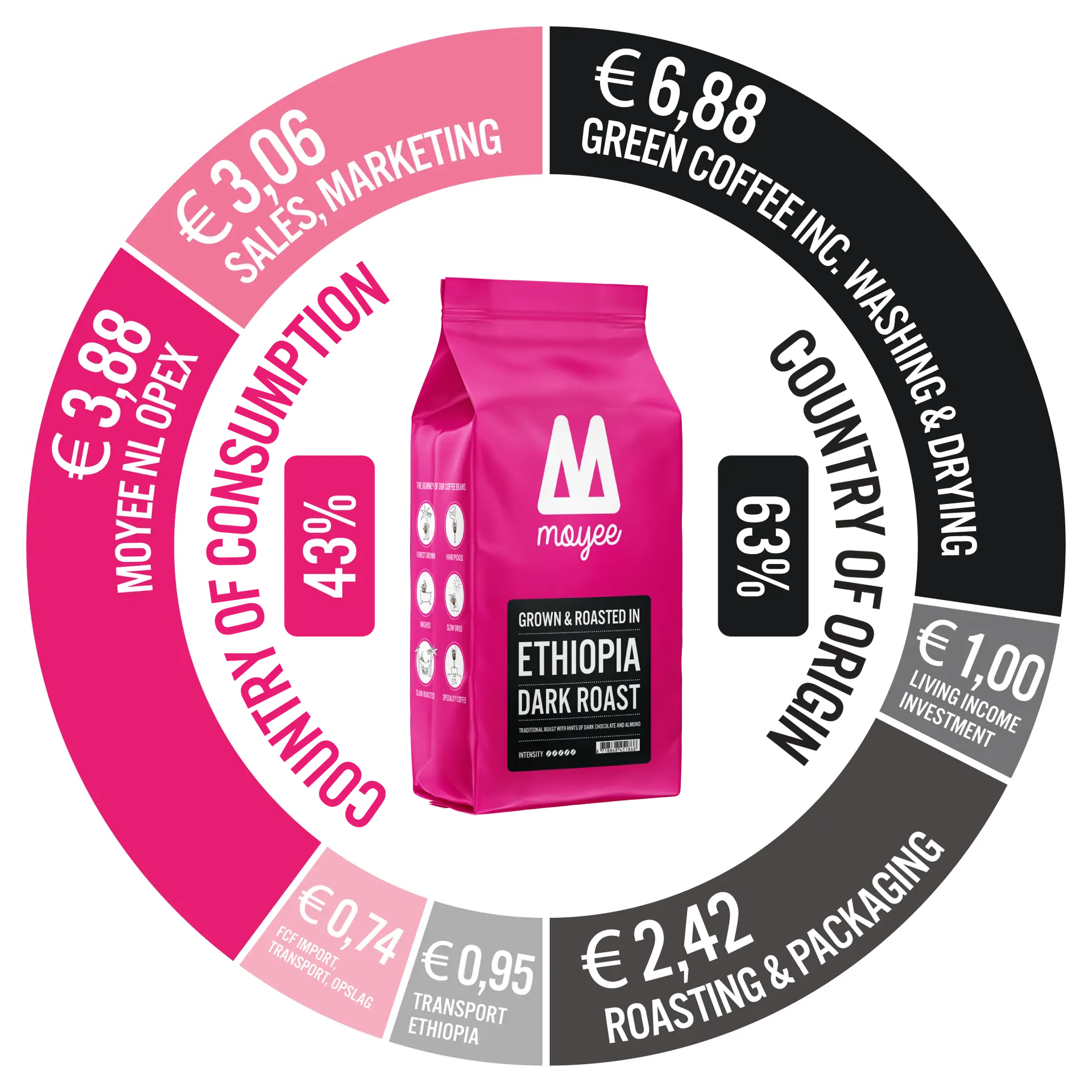 Dark is roasted at a state-of-the-art facility in Addis Ababa, trucked their fresh from the fields where the beans were picked. It is arguably the shortest supply chain from field to packaging. By roasting at origin we ensure that at least 50% of the value remains within the coffee communities themselves.