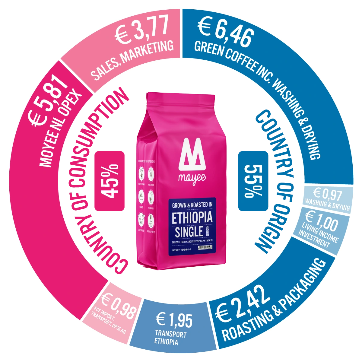 Moyee is in direct contact with more than 658 farmers who grow the cherries of the Single in Limu, Ethiopia. Coffee plants are at an altitude of more than 1,600 meters under the canopy of a natural coffee forest. From November until January, the ripe, red berries are picked by hand and processed at our own washing station.